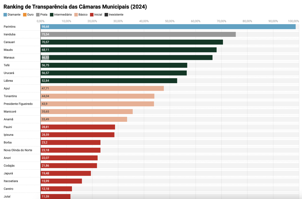 A Câmara Municipal de Manaus (CMM) ficou em quinto lugar no ranking de transparência do Ministério Público de Contas do Amazonas (MPC-AM) referente ao ano de 2024. O levantamento, que avaliou órgãos públicos de todo o estado, apontou que o Legislativo manauara esteve atrás das cidades de Parintins, Iranduba, Carauari e Maués no quesito transparência.
