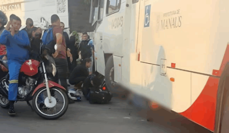Motociclista e passageiro têm pernas esmagadas por ônibus em Manaus; veja vídeos